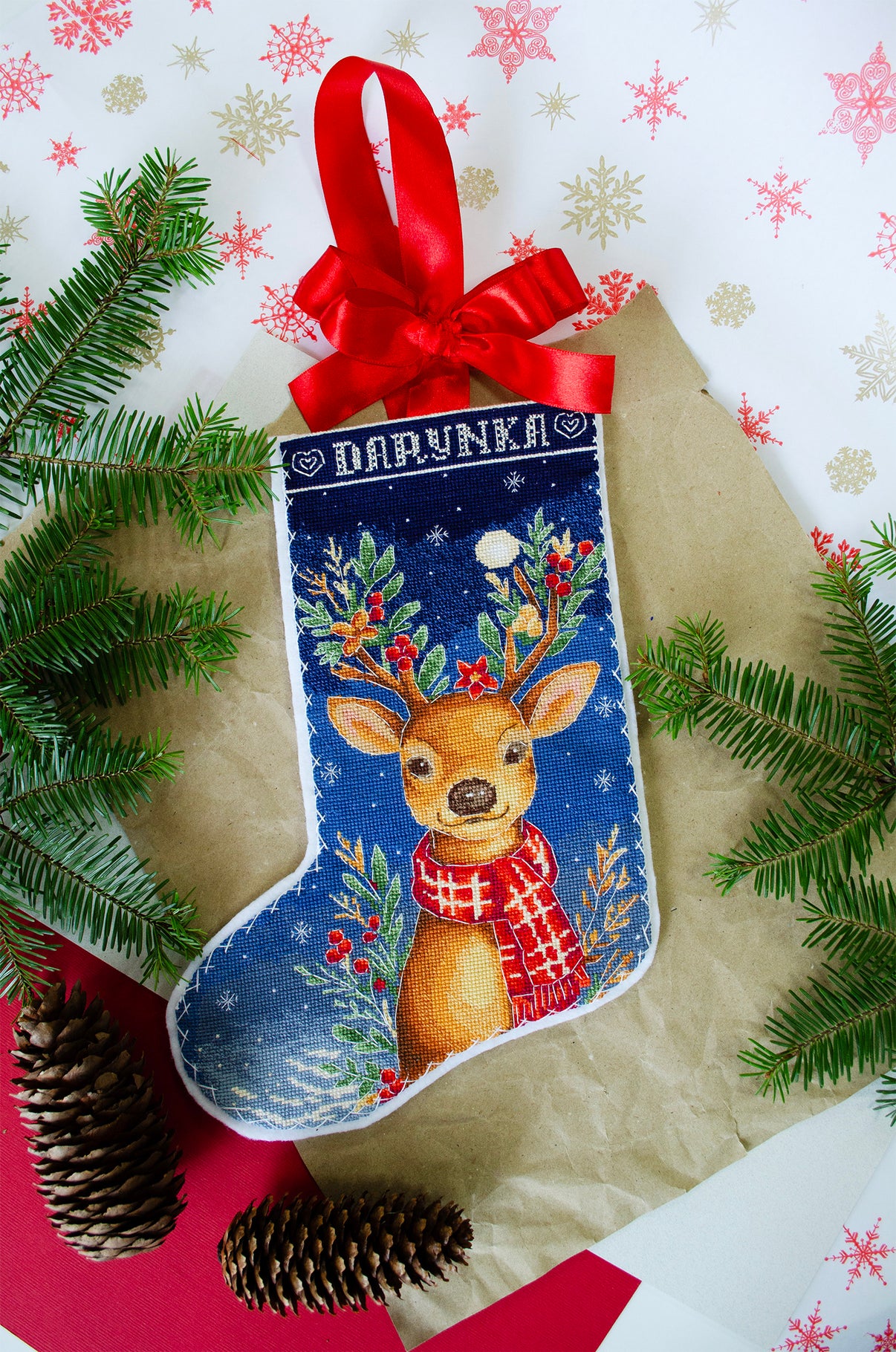 The set is completed with a canvas 280*370mm white color count 18, threads 102m, additionally felt 3mm thick 200*280mm, fabric (doubler) white color for sealing the finished embroidery 200*280mm, decorative ribbon red color - 100cm. A cross-stitched Christmas boot will be a wonderful decoration for a festive interior. The embroidery is made with great attention to detail, and the bright red bow adds a special charm to the product. Perfect for gifts or as part of a New Year's decor. (23 colours). Dimensions 18*27cm / 7,09*10,63in. Made in Ukraine.