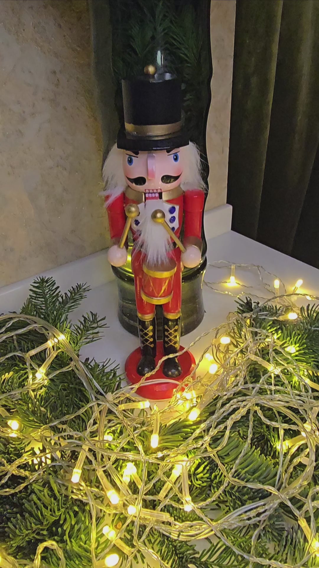 This elegant nutcracker, dressed in a bright red uniform with golden accents, proudly holds his drumsticks. His tall black hat and detailed boots add a touch of royalty. He will bring a festive and commanding presence to any holiday décor, perfect for those who love the classic Christmas aesthetic with a touch of sophistication.