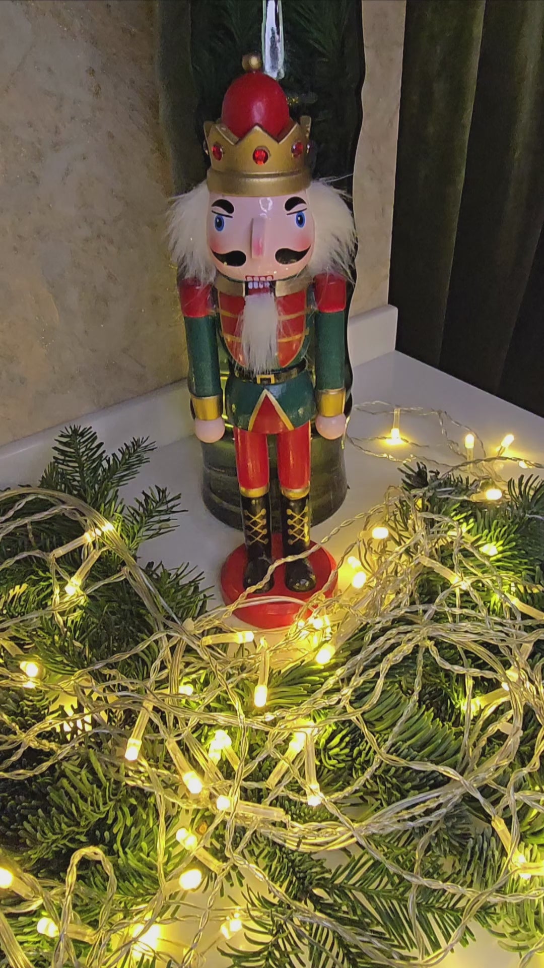 Adorned in royal green and red attire, this king nutcracker wears a golden crown with jeweled accents. His dignified expression and grand stature make him a true centerpiece for your holiday collection. Let him guard your home with style, adding a noble flair to your Christmas decorations.