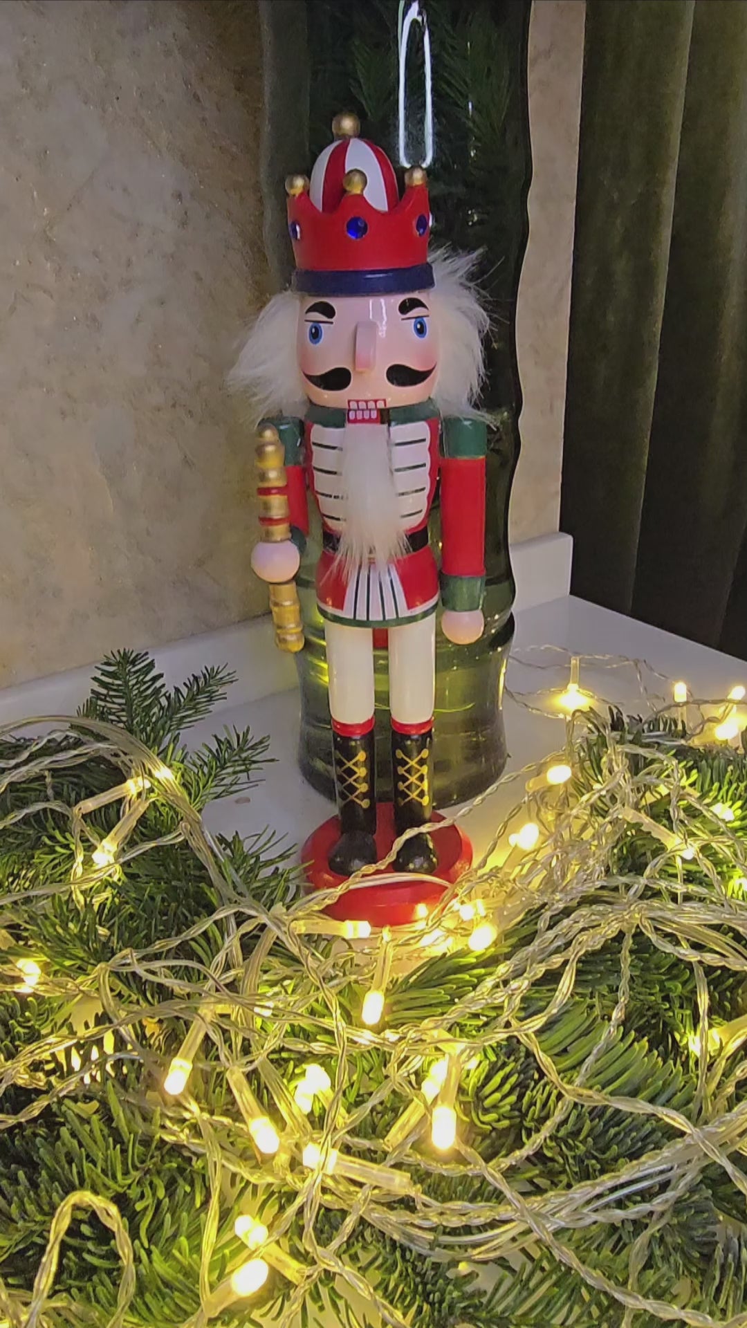 Dressed in festive red, white, and green, this king nutcracker brings joy and cheer to the season. His vibrant crown and holiday-themed outfit make him a perfect addition to your Christmas setup. With his cheerful colors and joyful demeanor, he’s sure to brighten up any room and spread holiday spirit.