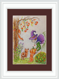 Halloween inspired counted cross stitch design by Neocraft. Witch with purple hat and pumpkin together with small forest animals.