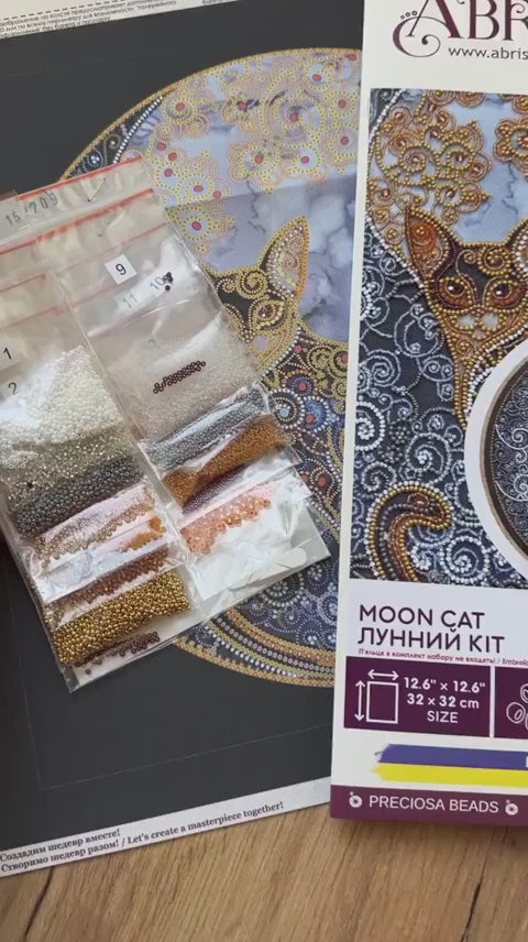 In each carefully assembled box Main Bead Embroidery Kit Moon cat (Deco Scenes) after purchase and delivery you will find: a large piece of natural art canvas with a printed image-scheme (fabric for embroidery) larger than the size of the picture - 320 x 320 mm. - with enough stock to make it convenient to embroider and design the finished picture! The world's best beads Preciosa Ornela (Czech Republic), with "stock" - more than 11423 beads, high-quality bead needles from Japan , and most importantly - detailed instructions, the scheme for beadwork with a key, specially developed by our designers for each plot separately and already applied to the canvas!