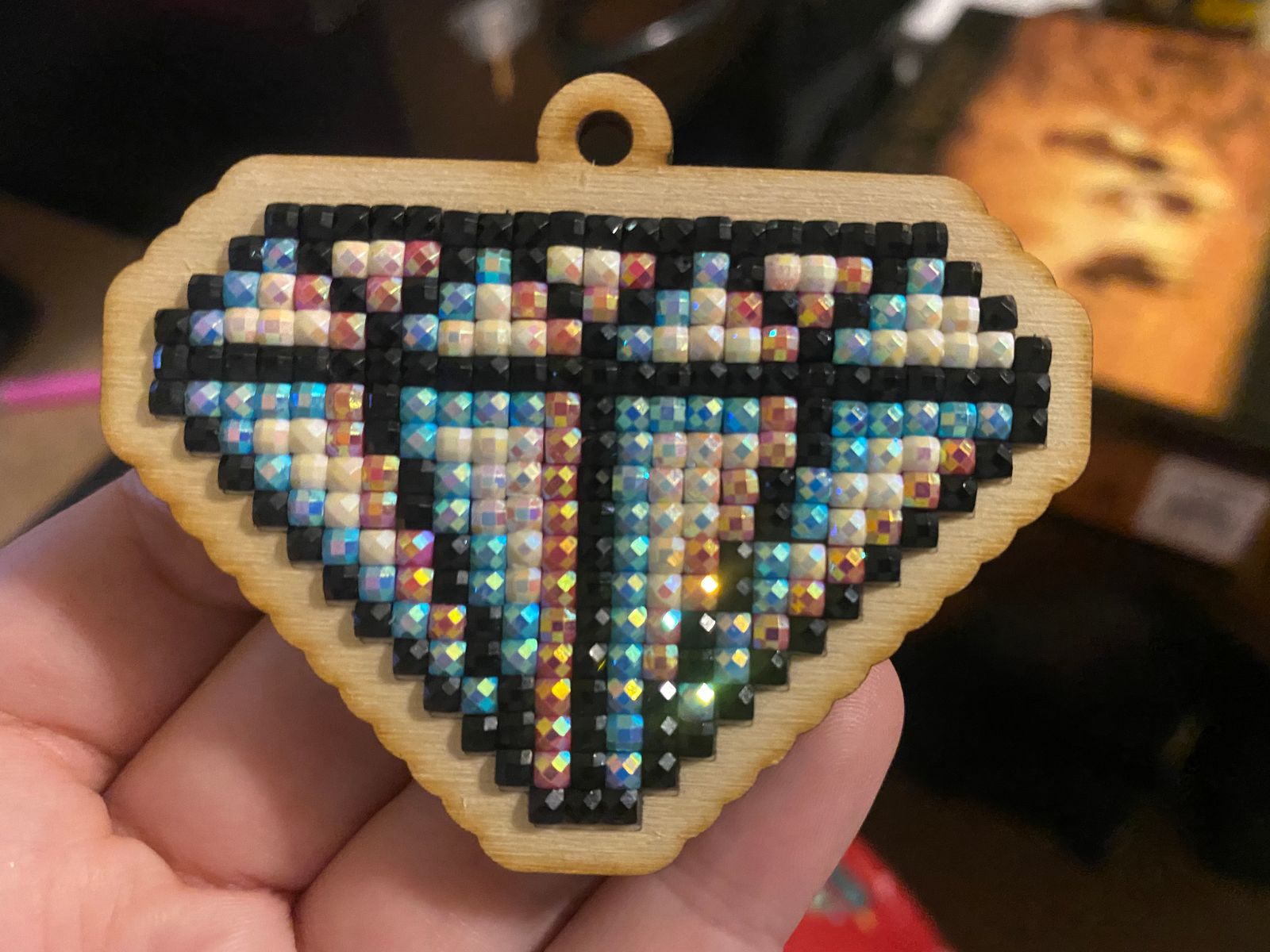 Completed with colorful and shiny rhinestones, the finished plywood accessory will make an original home decor element or a fancy gift.