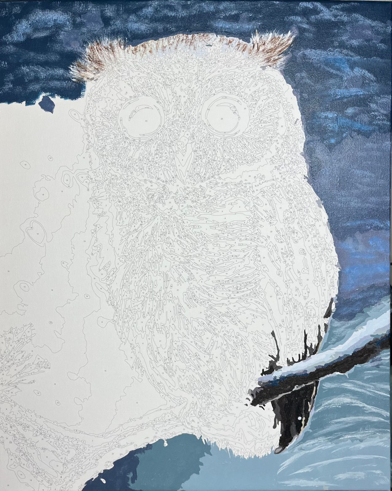 I bought this because I usually paint landscapes and had several eye surgeries preventing me from doing my usual paintings. I thought with paint by number I could focus on an area under a magnifier and still paint. I thought this owl looked less detailed but wow I was wrong I am using tiny acrylic nail brushes and still have trouble keeping in the little shapes. I figure once I get my sight back to normal I can go over this and make it look more realistic. I already added some snow to outline areas where there was color blobs and no blending. So at least this kept me painting. Nice canvas and frame. I have some concerns I will run out of paint, the paint is thick so if you add a couple drops of water it is easier to paint with and it goes further. I have areas where some of the canvas shows thru but I don’t want to use up paint yet. I can always add snow flakes or stars to fix that later if necessary. I have to take frequent breaks as even under a magnifier it strains my eyes., so I’m not sure how long this will take me to complete it. But I am enjoying the process. I would recommend just be aware it can test your patience!