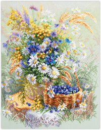 Kit contains: Fabric Zweigart Aida 14 (col.611, light green), Threads: mouline DMC, Number of Colors:56. Embroidery instructions in English, German, French and Spanish; color symbol scheme. Dimensions: 32*40cm / 12,6*15,75inches