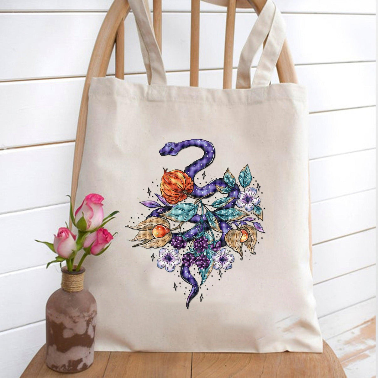 Blue snake with physalis, flowers and ornaments. Size 118*143 stitches On 16 count white Aida canvas 21.41x25.94 cm DMC threads 33 colors. Instruction language: EngPattern includes: 1 PDF file ...