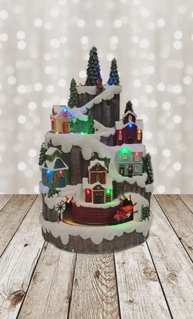 Create a picturesque holiday scene with this mountain village, featuring charming houses, snowy trees, and a moving train. This multi-level decoration adds depth and interest to any display, capturing the warmth and beauty of a snowy village at Christmas time. It’s a delightful centerpiece for any holiday setup.